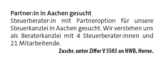 Steuerberater:in mit Partneroption für unsere Steuerkanzlei in Aachen gesucht. Wir verstehen uns als Beraterkanzlei mit 4 Steuerberater:innen und 21 Mitarbeitende.