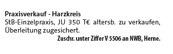 StB-Einzelpraxis, JU 350 T€ altersb. zu verkaufen,