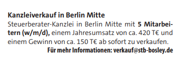Steuerberater-Kanzlei in Berlin Mitte mit 5 Mitarbeitern (w/m/d), einem Jahresumsatz von ca. 420 T€ und einem Gewinn von ca. 150 T€ ab sofort zu verkaufen.