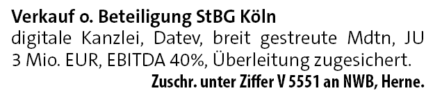 digitale Kanzlei, Datev, breit gestreute Mdtn, JU 3 Mio. EUR, EBITDA 40%, Überleitung zugesichert.