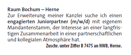 Zur Erweiterung meiner Kanzlei suche ich einen engagierten Juniorpartner (m/w/d) mit eigenem Mandantenstamm, der Interesse an einer langfristigen Zusammenarbeit in einer partnerschaftlichen und kollegialen Atmosphäre hat.