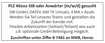 Zuschriften unter Ziffer B 7481 an NWB, Herne