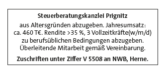 aus Altersgründen abzugeben. Jahresumsatz: